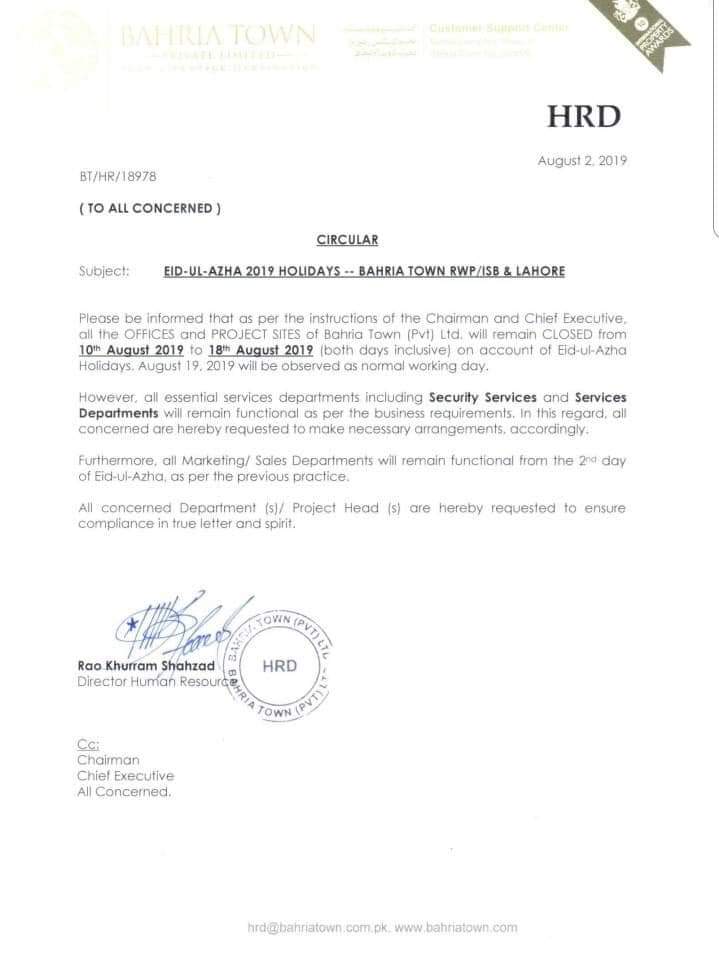 Bahria Town Karachi has announced the schedule of Eid-ul-Azha 2019 Holidays through a circular issued by HR department. The society office will remain closed during the holidays, however Security, Maintenance Services, Danzoo, Cinegold Cinema and Hospital will remain open and operational during the holidays.