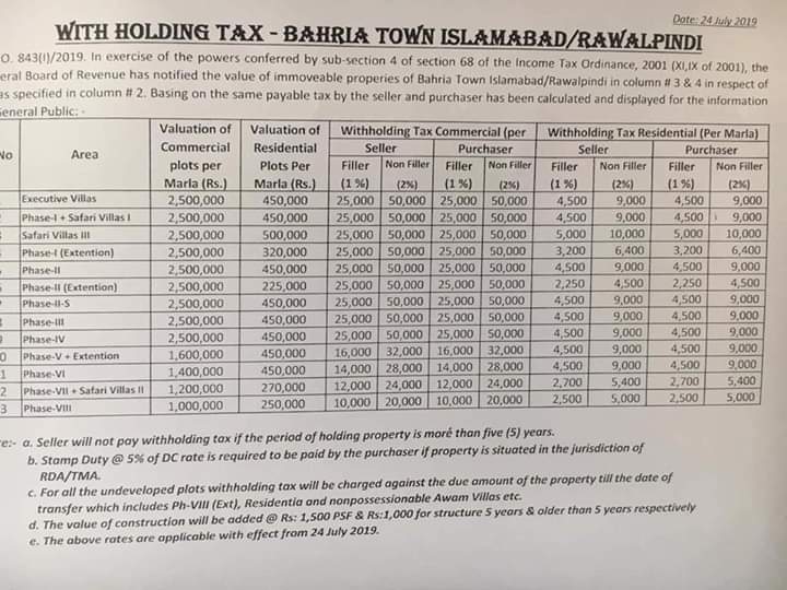 Following are the details of Withholding tax applicable on buyer and seller during transfer of property in Bahria Town Rawalpindi: