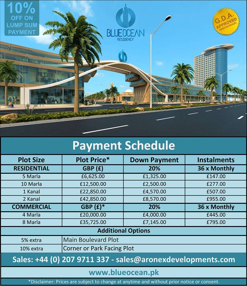 Blue Ocean Residency offers 5 marla, 10 marla, 1 kanal and 2 kanal residential plots, as well as 4 marla and 8 marla commercial plots on 3 years easy installment plan. As the society is spread over 100 acres, they have around 700 plots in total including residential and commercial ones. Bookings start with 20% down payment, while remaining amount is payable in 36 equal monthly installments. It is important to mention that Aronex Developments have mentioned all prices in GBP, however you may discuss on payment currency and method before booking.