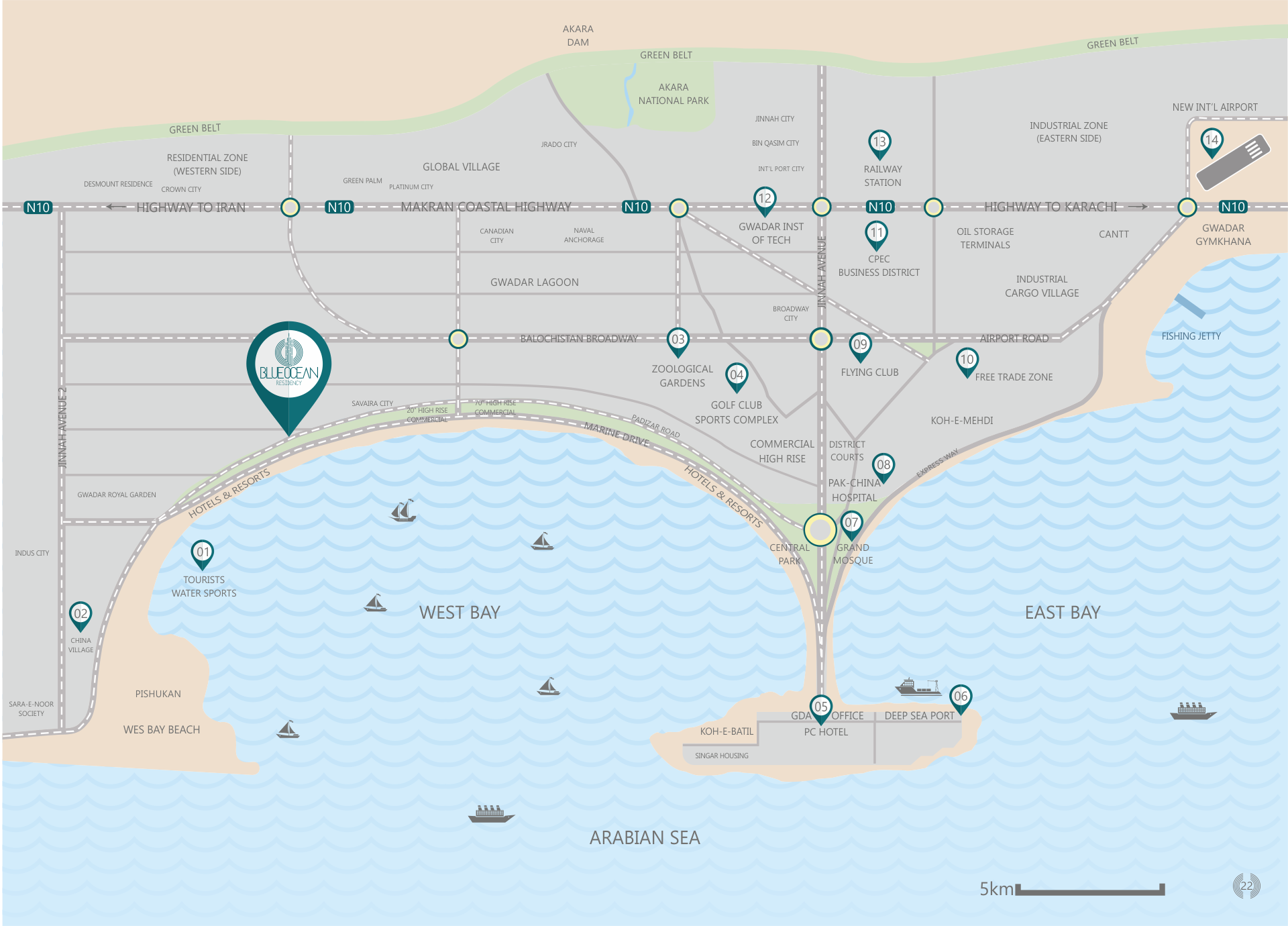 As you can see on the map above, the society lies on Padizar Road, while Marine Drive is at about 350 meters distance from Blue Ocean Residency. Gwadar Beach lies at about 500 meters distance from the society, so residents can enjoy the recreational facilities on the beach as well as on marine drive just next to their homes.