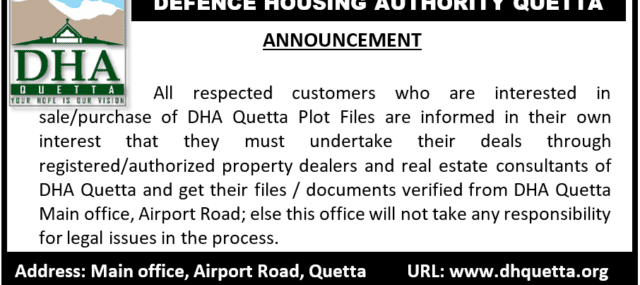 According to the notice, DHA has informed general public, who are interested in sale purchase of DHA Quetta files, to undertake their deals through registered/authorized property consultants only.