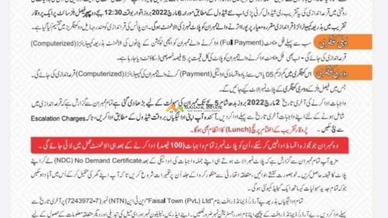 The members who could not clear the payments will only be included in the event if they pay the installments or full payment in the given time. Moreover, the members are requested to acquire the NDC (No Demand Certificate) after clearing the dues and getting ownership of their plots.
