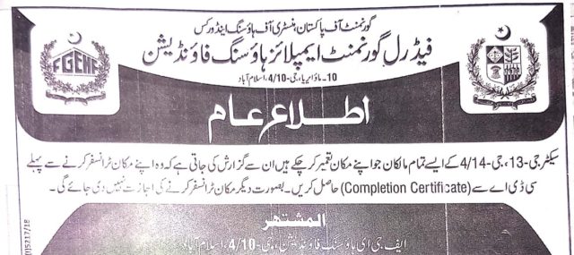 Federal Government Housing Foundation (FGEHF) has published an important notice for those who have built their houses in Sector G-13 and G-14/4 Islamabad. It will be mandatory for them to obtain completion certificate from Capital Development Authority.