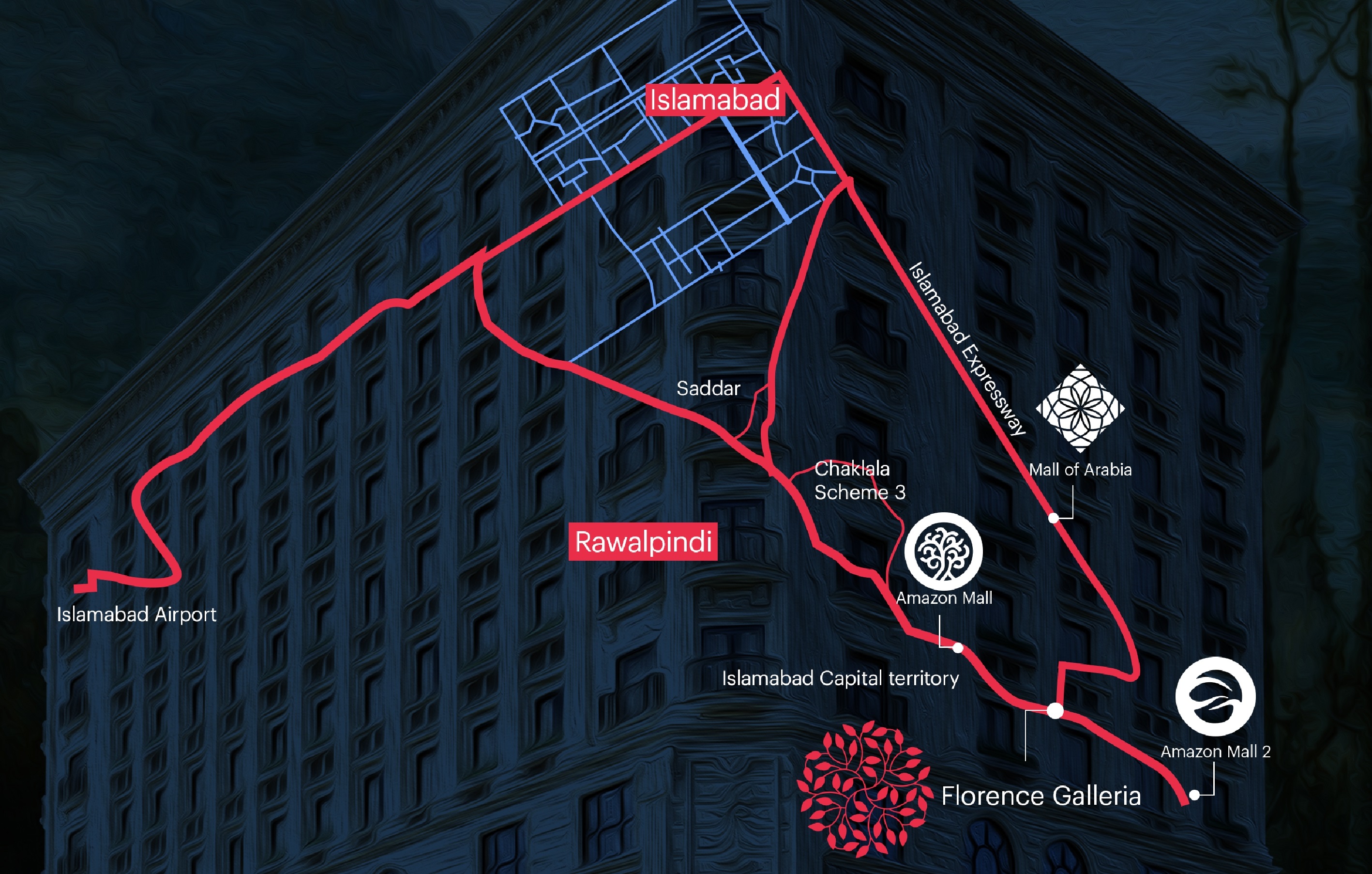 Florence Galleria is ideally located near DHA Islamabad Gate No. 2. It lies close to D Mall and WTC Giga Mall. It is easily accessible from GT road, and connected to Islamabad Highway through DHA Phase 2.