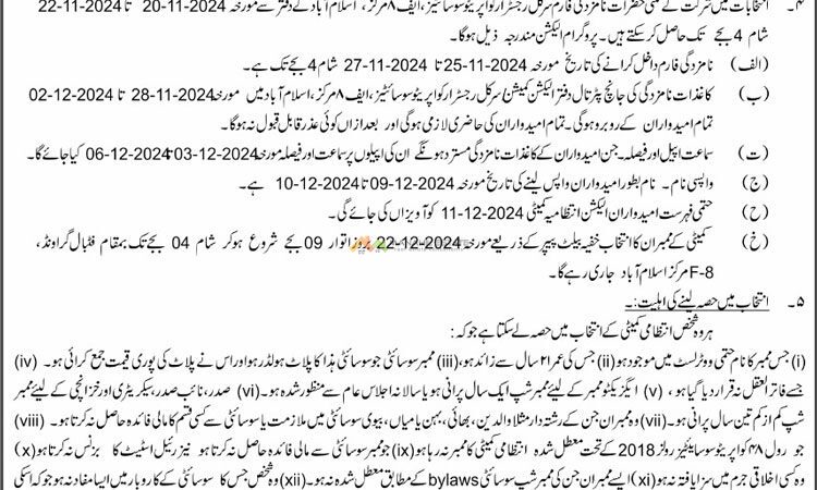 Nomination papers will be accepted from November 7 to November 11, 2024, and objections can be filed from November 12 to November 14, 2024. The final list of candidates will be displayed on November 19, 2024. Voting will take place from 9:00 a.m. to 4:00 p.m. on December 22, 2024, at the designated location in F-8, Islamabad.
