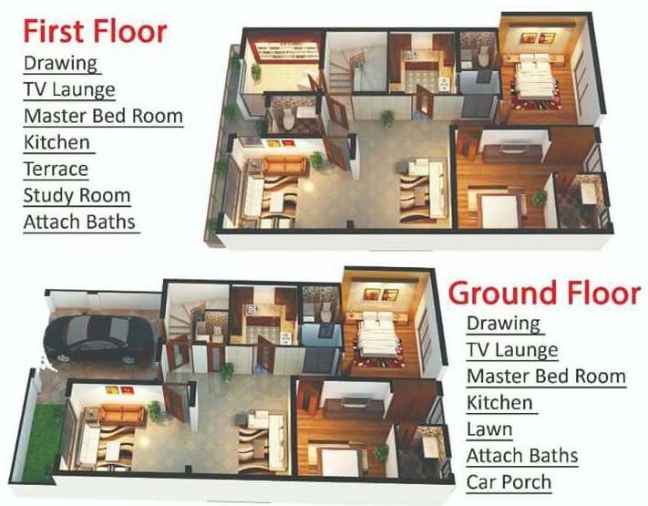 As you can see on the floor plan given above, each floor has 2 bedrooms with attached baths, kitchen and tv lounge, so two small families can easily accommodate in these homes. This is a general plan given for 7 marla homes, however 10 marla, and 1 kanal homes may have different layout plan which are not available to us.