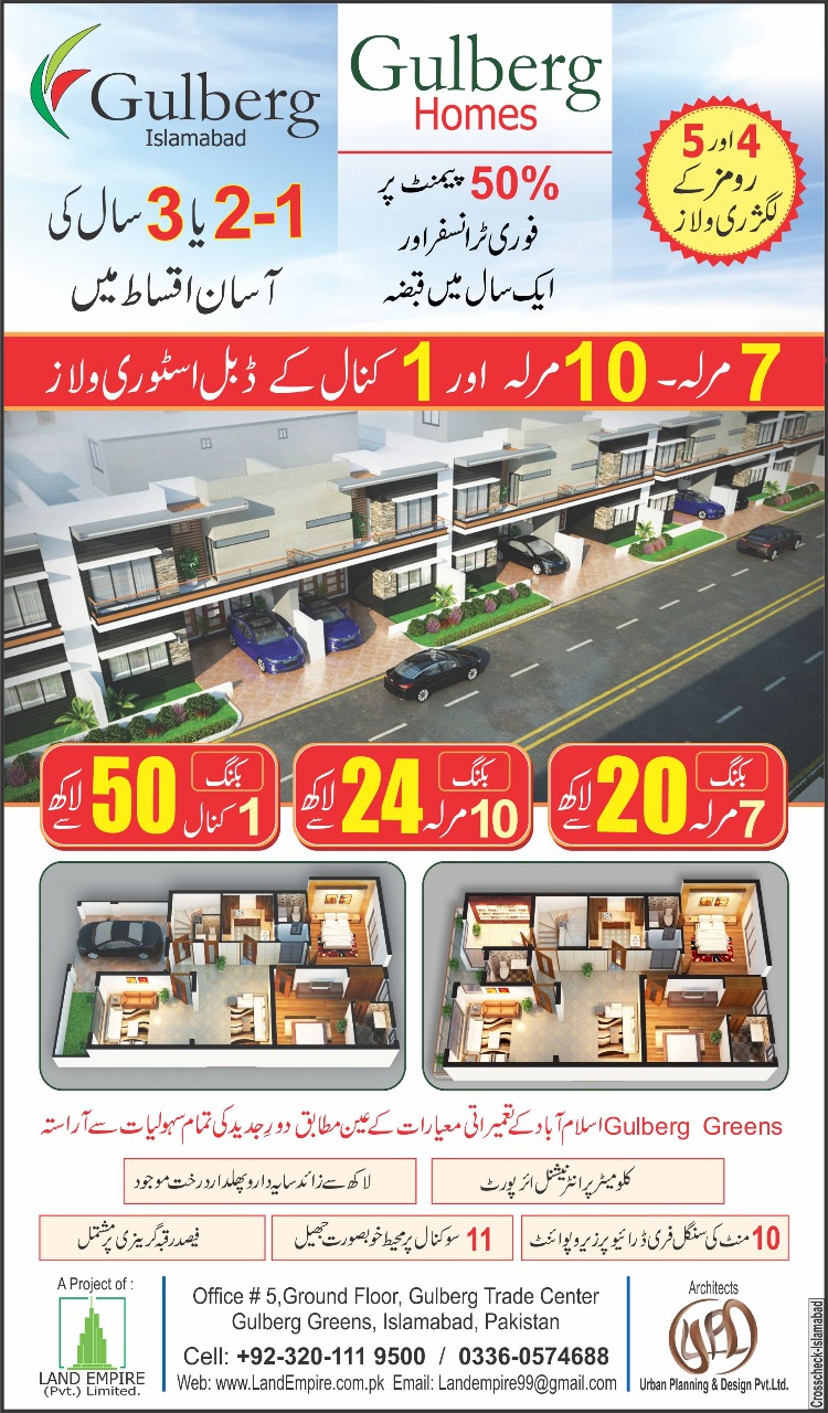 Gulberg Homes is a new project of 7 marla and 10 marla double storey luxury villas in Gulberg Residencia Islamabad. The project is sponsored by Land Empire (pvt) Limited, while UPDL is the consultant and architect of this project. Gulberg Homes offers double unit double storey villas on 2 years and 3 years installments plan with just 15% down payment. There are also some villas of 1 kanal being offered in Gulberg Homes, however we do not have its payment plan and layout plans with us.
