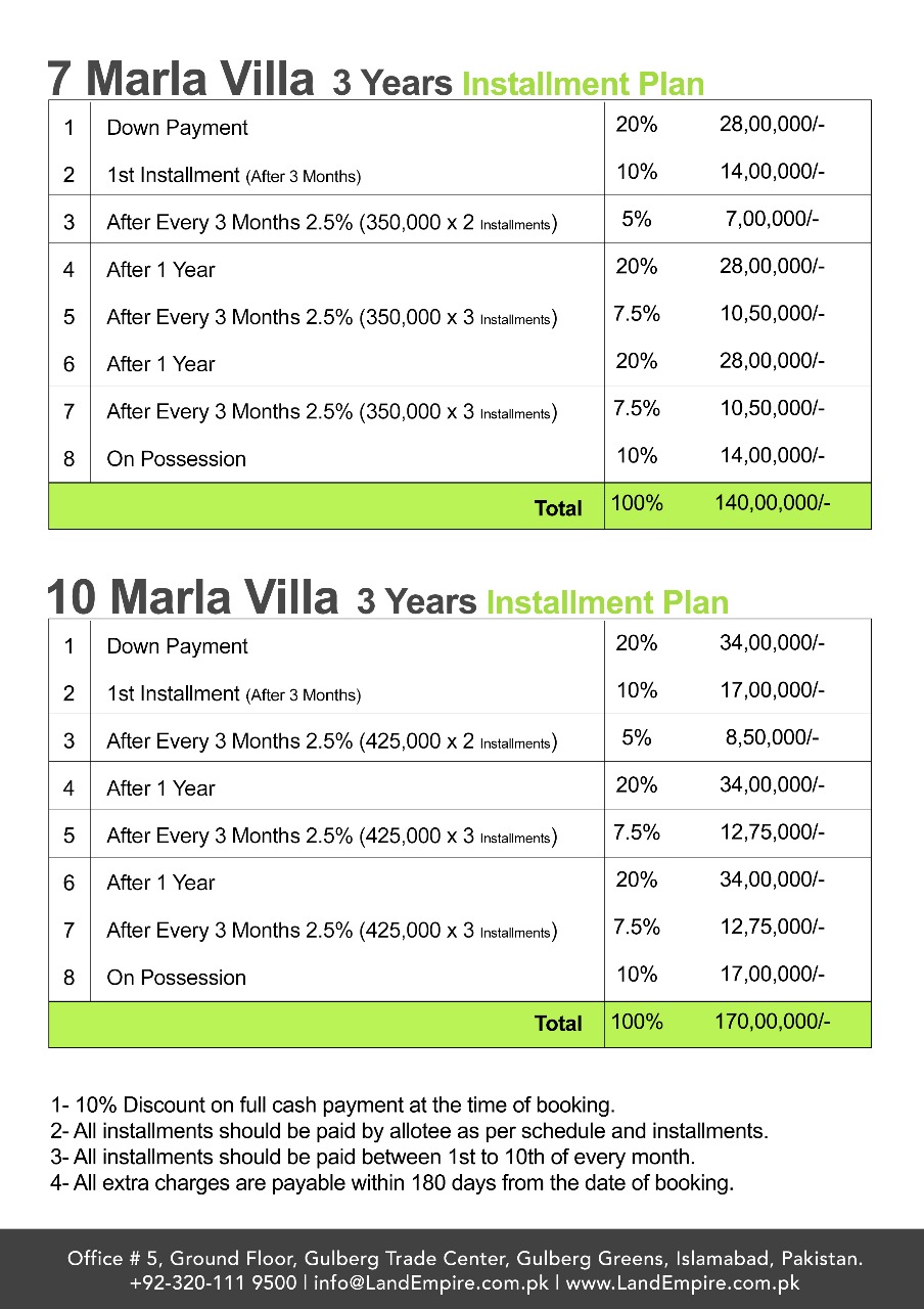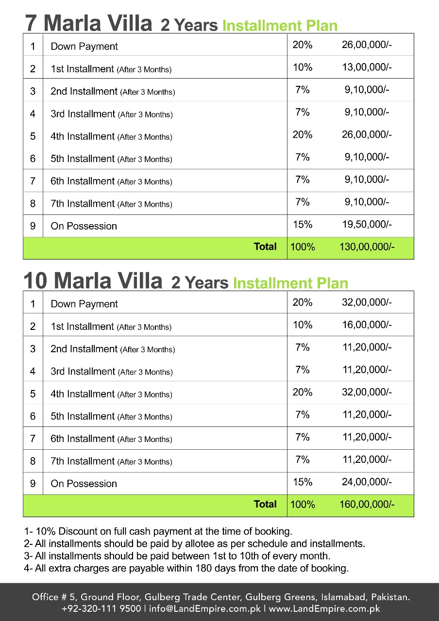 Following is the payment schedule of 7 and 10 marla villas on 2 years installment plan: