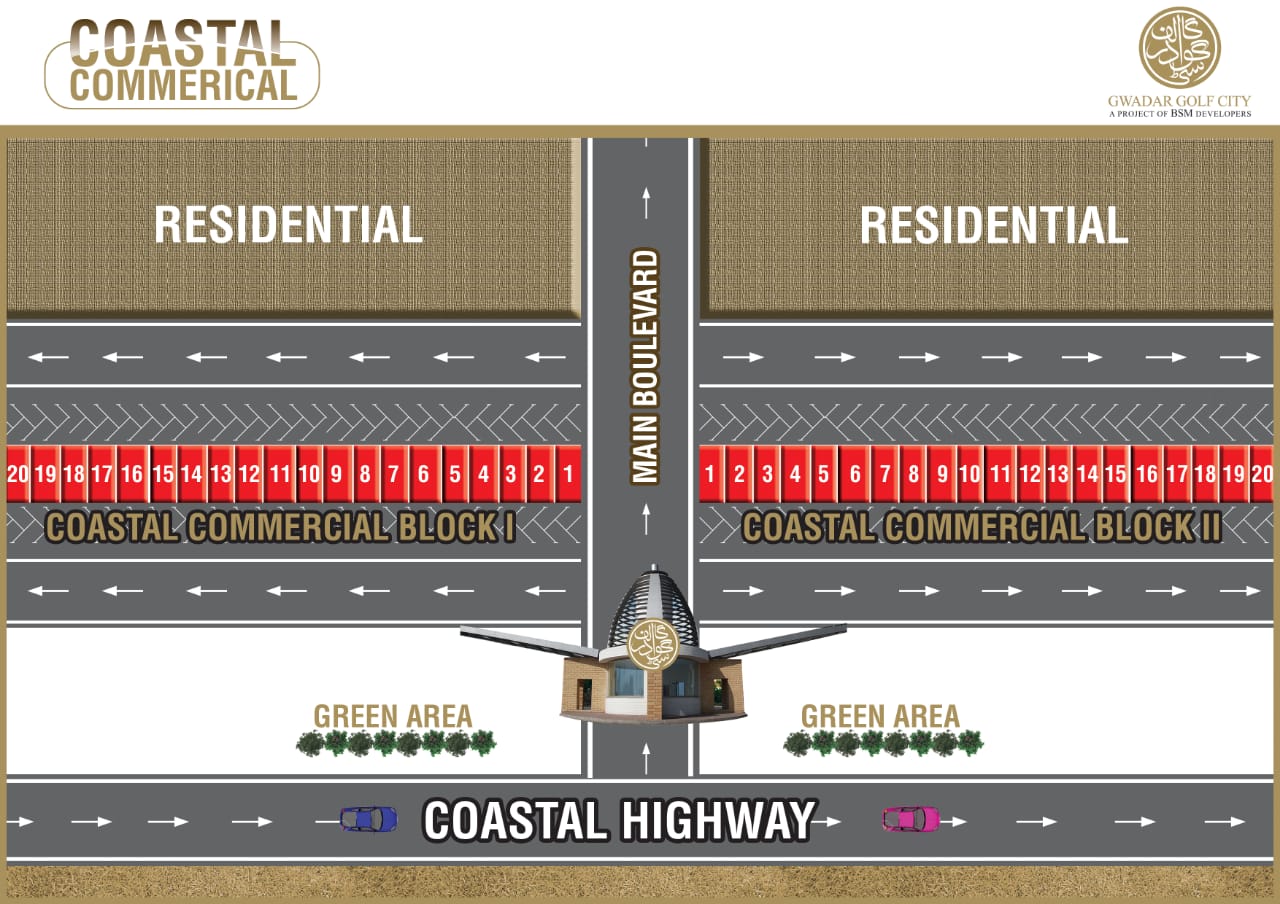 Coastal Commercial is meant for those who want to build hi-rise commercial plazas at the most prominent location in Gwadar Golf City. It is more appealing due to its location just next to the main entrance gate on Coastal Highway, hence it is called “Coastal Commercial”.