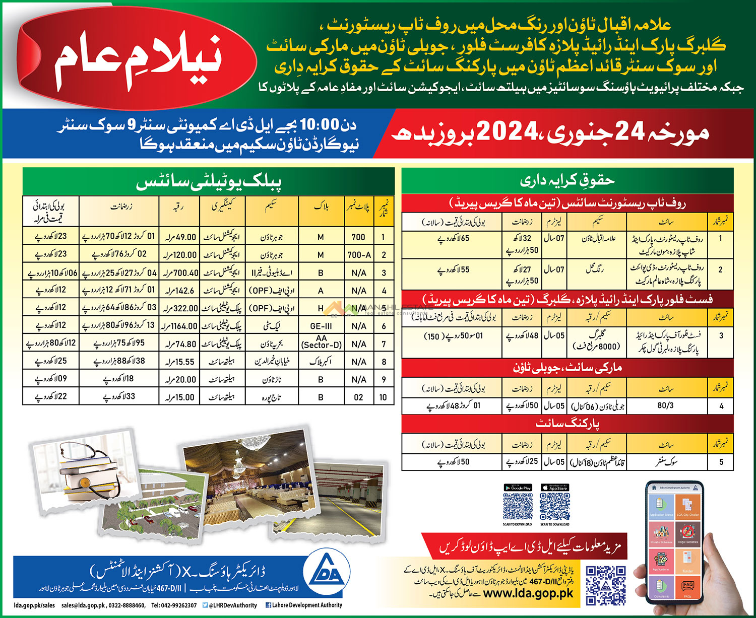 The auction will be held on 24 January 2024; furthermore, the venue for the LDA grand auction 2024 is the LDA community center, 9, Civic Center, New Garden Town Scheme Lahore. Different categories of properties will be presented for sale and lease in Lahore city. It is important to mention that this is an open auction so anyone can take part in it.