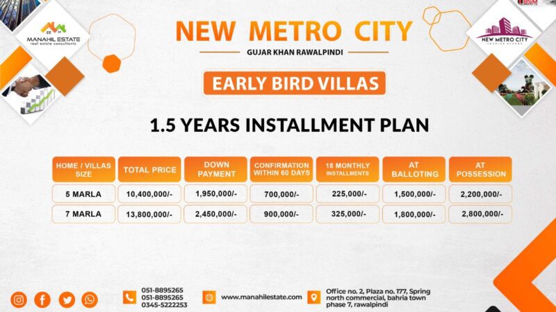 Contact Manahil Estate for more information on Early Bird Villas of New Metro City and the booking procedure. You can contact us via WhatsApp/phone at +92-345-5222253, email us at marketing@manahilestate.com, or fill out the inquiry form at our website. Our dedicated agents dealing with New Metro City Gujar Khan will assist you shortly.