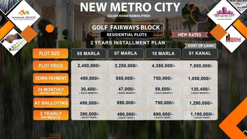 The management of society has introduced new prices for New Metro City Gujar Khan; these prices will be applicable only on the new booking of the New Metro City Golf Fairways Block. Plots can be booked with a down payment and the remaining dues can be cleared in 24 monthly installments.