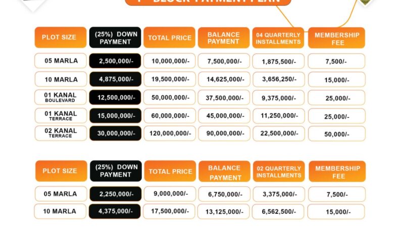 - Plots belonging to this category can be booked with PKR 15,000,000 whereas the total price is PKR 60,000,000/-