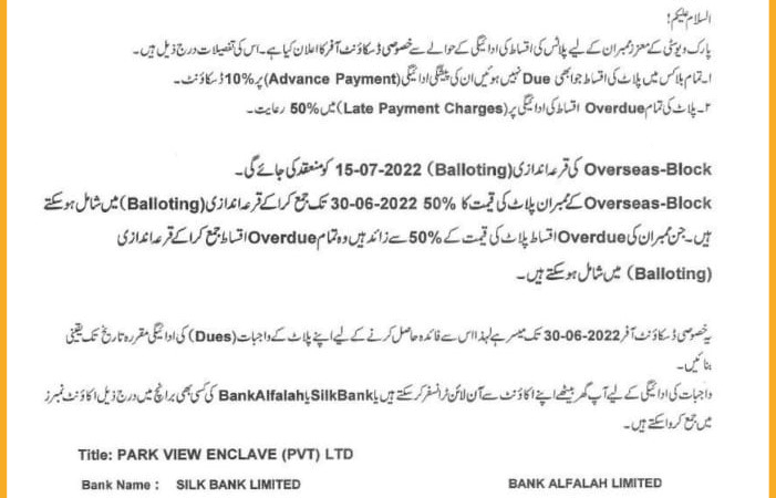 Additionally, the society is also offering a flat 50% on clearance of overdue installments. The payments should be made in favor of the society’s account named “Park View Enclave (PVT) LTD” through any branch of Silk Bank or Bank Alfalah.