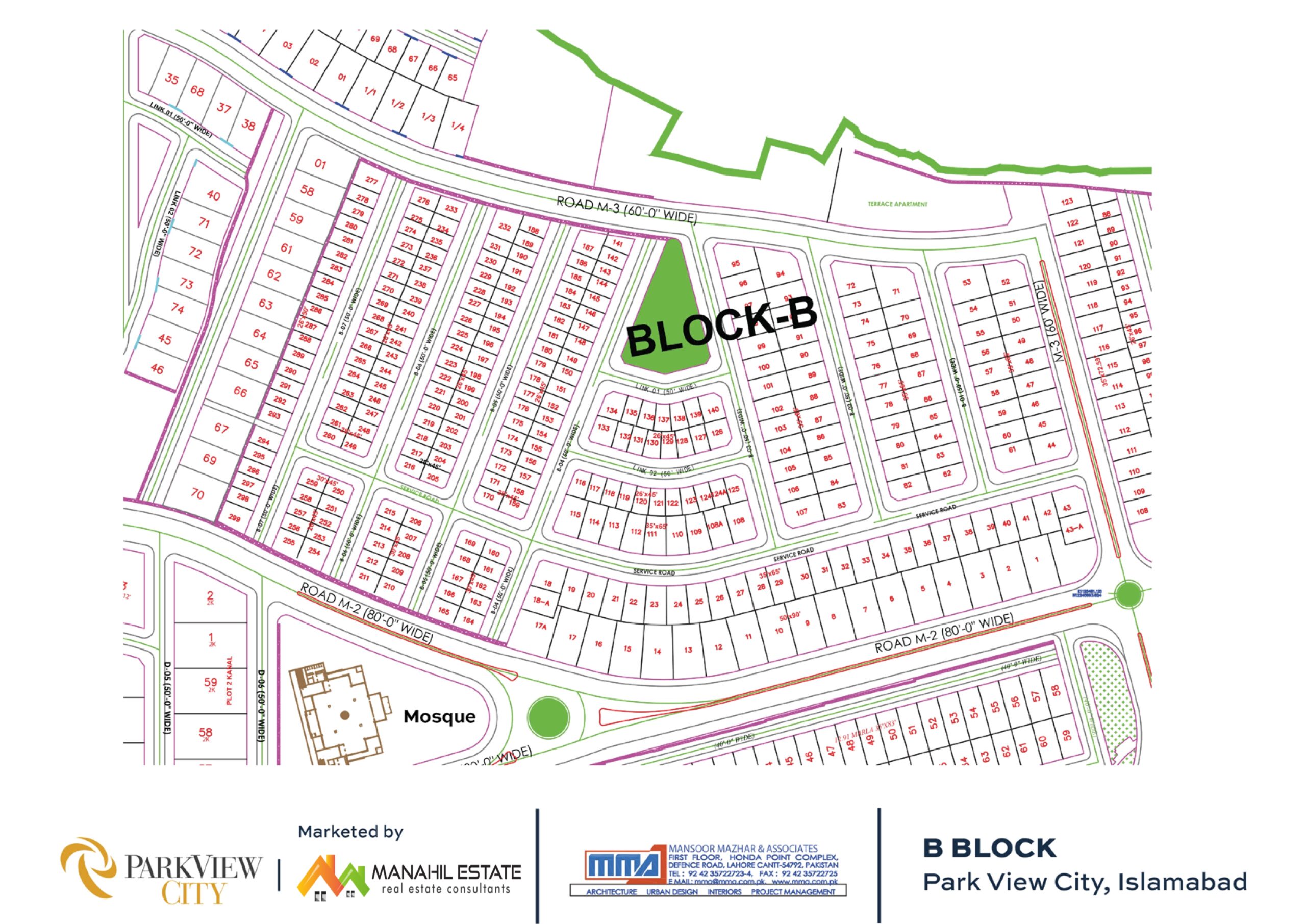 Block B is also 60% developed and offers 5, 10 Marla, and 1 Kanal plots. It lies right next to Block A. Park view city closed the bookings for this block. However, plots are available on resale. Blue Mosque, a major attraction of the society is present near this block.
