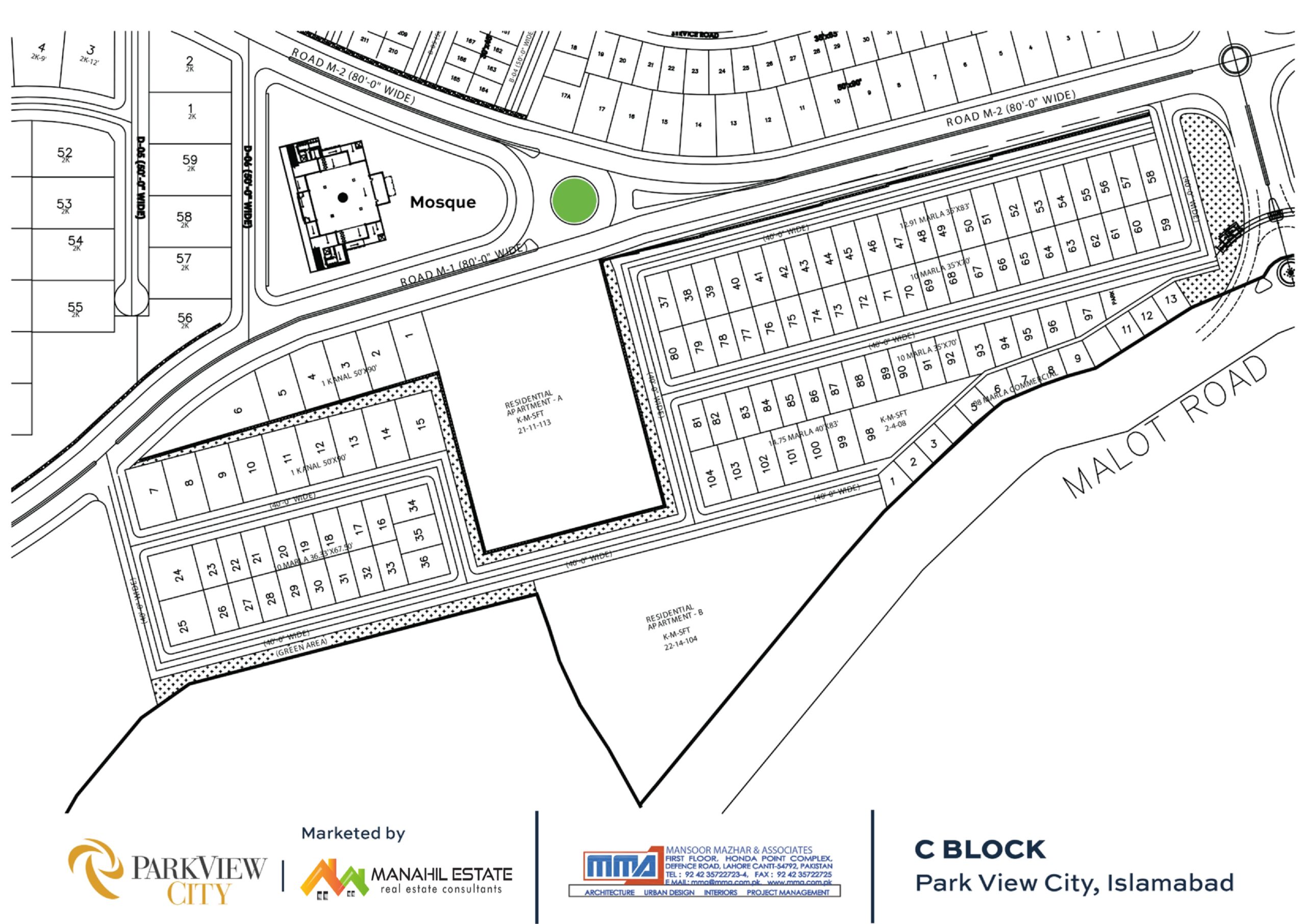 Block C of Park View City features a good location. A heightened block offers 10 Marla and 1 Kanal terrace plots and residential homes. The food court is another specification of this block.