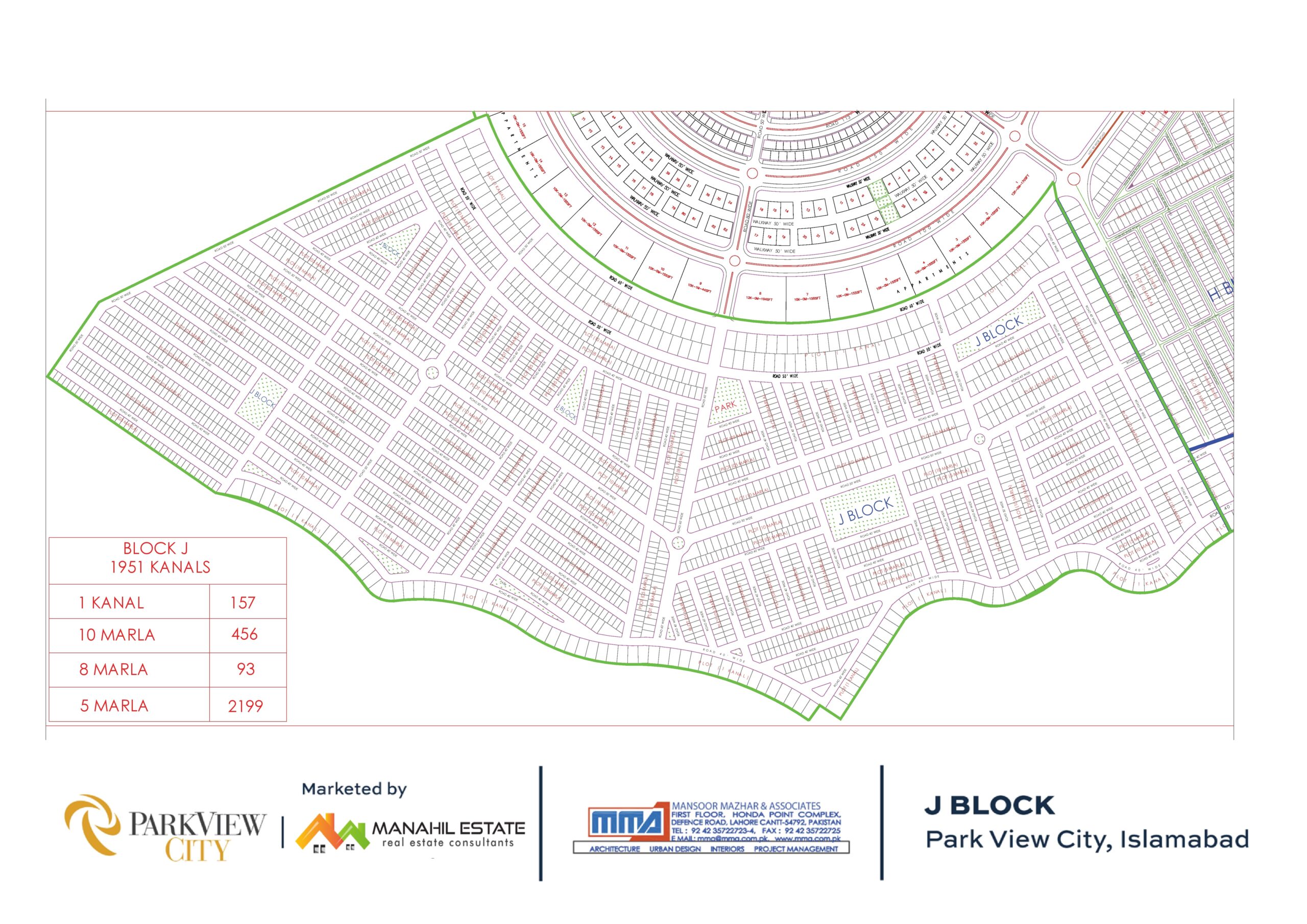 Block J lies close to Overseas Block & Golf Estate of Park View City. It offers 5 , 8, 10 Marla and 1 Kanal residential plots. This block is highly attractive in terms of prices and future growth potential.