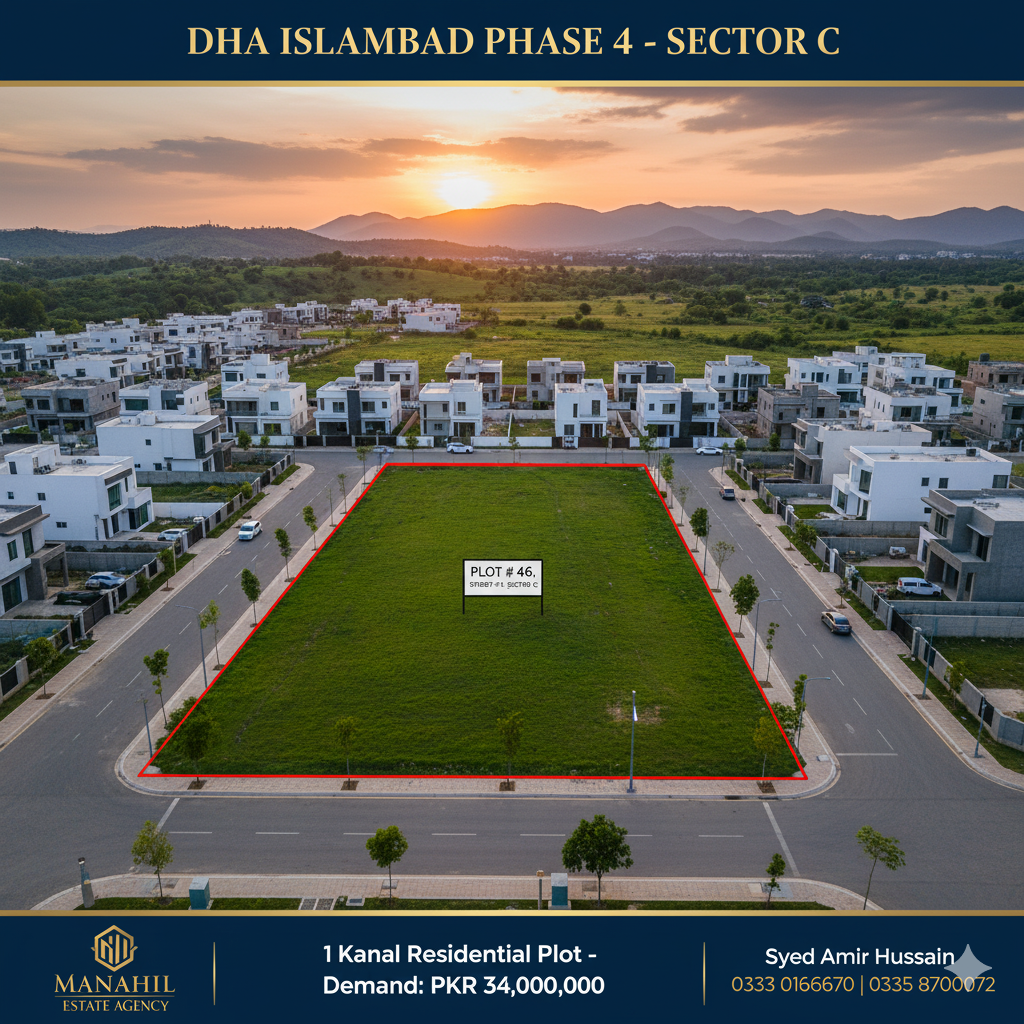 An excellent opportunity to acquire a spacious 1 Kanal Residential Plot (Plot #46) in the prestigious Sector C of DHA Phase 4, Islamabad. Situated on Street 12, this plot offers an ideal location for building your dream home in a rapidly developing and highly sought-after community. Sector C is known for its meticulous planning, modern infrastructure, and serene living environment, making this plot a secure and high-potential investment in one of Islamabad’s most promising real estate markets.