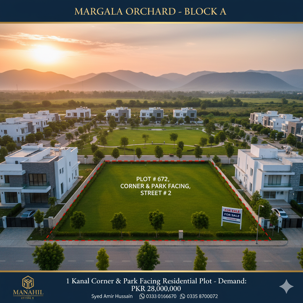 An extraordinary opportunity to acquire a truly prime 1 Kanal Residential Plot (Plot #672) in the prestigious Margala Orchard, Block A. Located on Street 2, this plot offers the rare and highly desirable combination of being both a Corner Plot and Park Facing. This dual advantage guarantees unmatched natural light, superior ventilation, breathtaking green views, and direct access to recreational spaces. Margala Orchard is renowned for its serene environment, stunning views of the Margalla Hills, and high standards of development, making this plot the ultimate choice for building a luxurious, custom-designed residence, or as an unparalleled investment with promising growth.