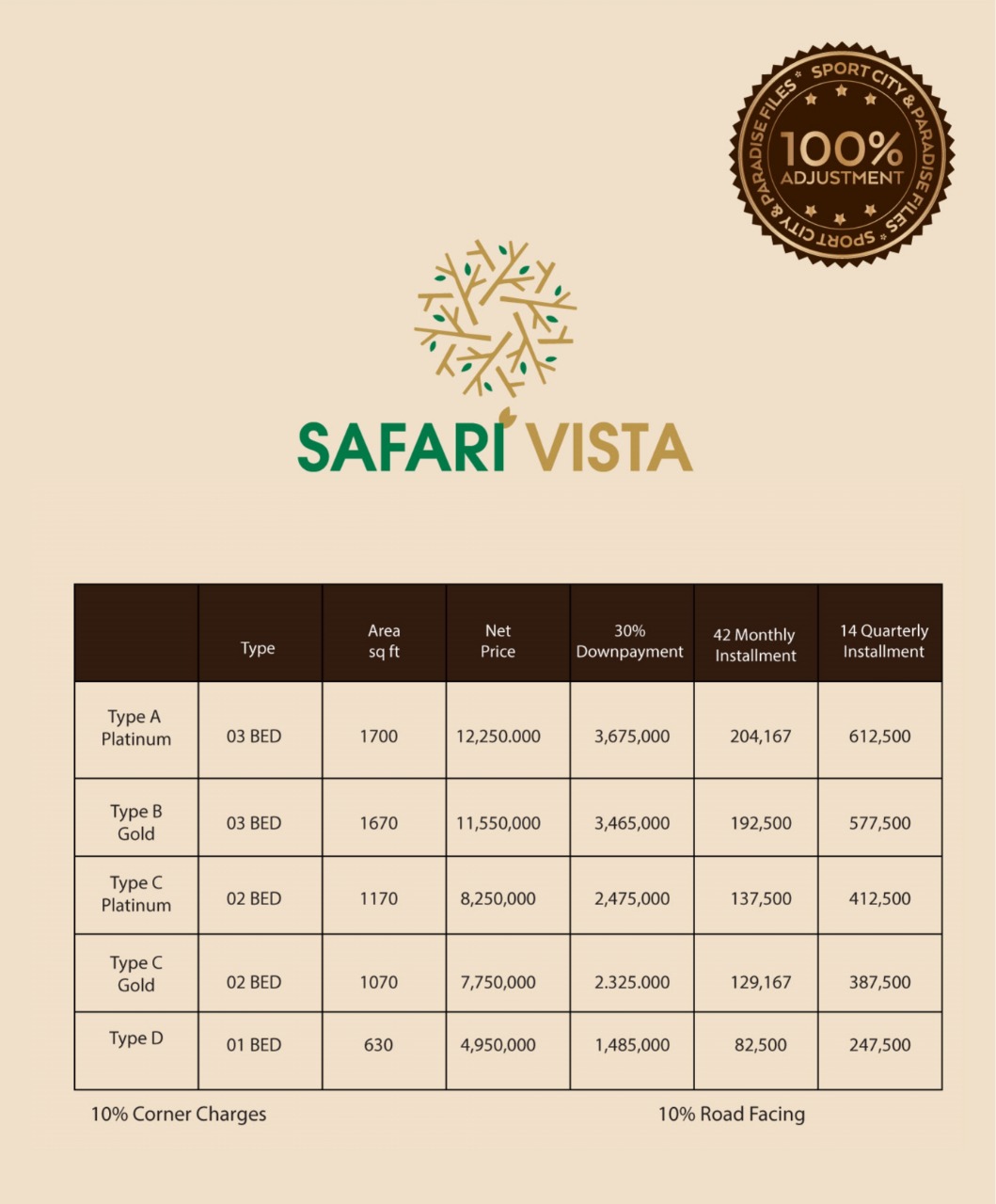 Important: If you have a plot file in disputed precincts of Bahria Sports City and Bahria Paradise, you can now adjust your file at 100% paid amount into Safari Vista Apartments.